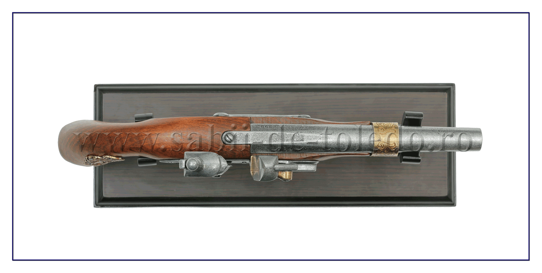 Pistolul este datat 1806, deci din perioada Imperiului. Acesta este si motivul pentru care decoratiunile aplicate pe maner contin acvila franceza imperiala precum si cifrul imparatului deasupra caruia se afla o coroana.
